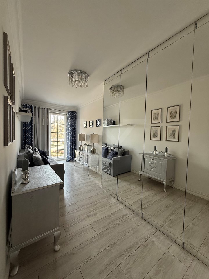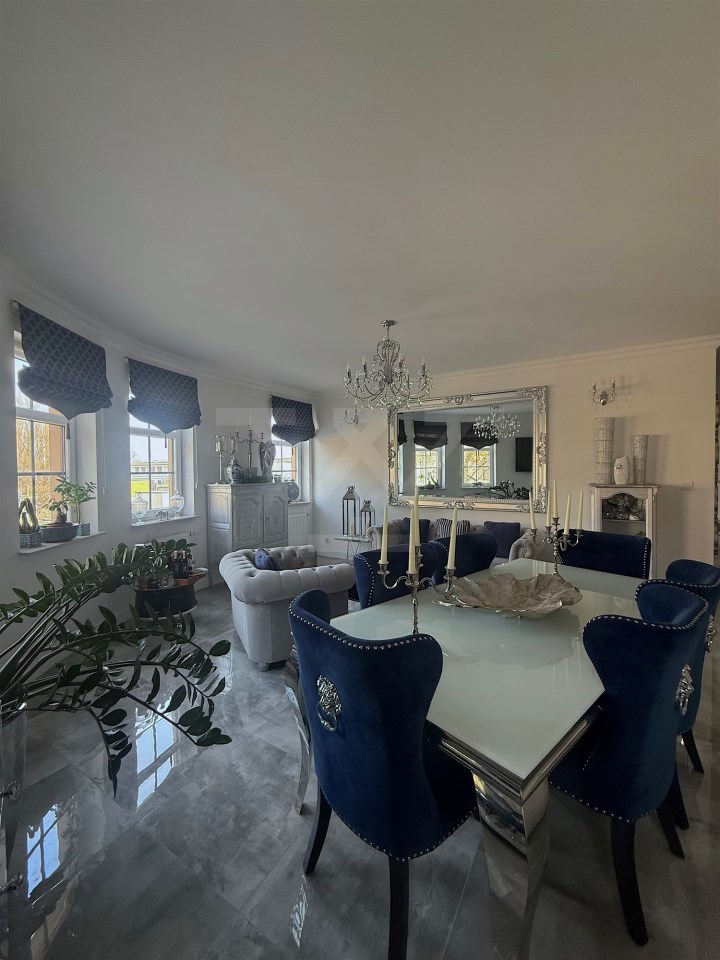 Wnętrze urządzone w eleganckim stylu glamour. Mieszkanie jest bardzo dobrze doświetlone dzięki dużej liczbie okien (mieszkanie narożne)