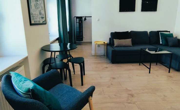 Mieszkanie typu studio znajduje się na drugim piętrze w budynku trzypiętrowym z windą oraz klimatycznym świetlikiem na klatce schodowej . Apartament urządzony w stylu loftowym , z naturalnie zachowaną cegłą na ścianach , duże okna wyposażone w rolety , zewnętrzne okablowanie dodaje klimatu kamienicznego loftu. W salonie rozkładana kanapa , TV, kuchnia wyposażone w niezbędny sprzęt , dodatkowym atutem tej oferty jest na wyposażeniu klimatyzacja .Mieszkanie bardzo słoneczne , łazienka z prysznicem razem z WC.