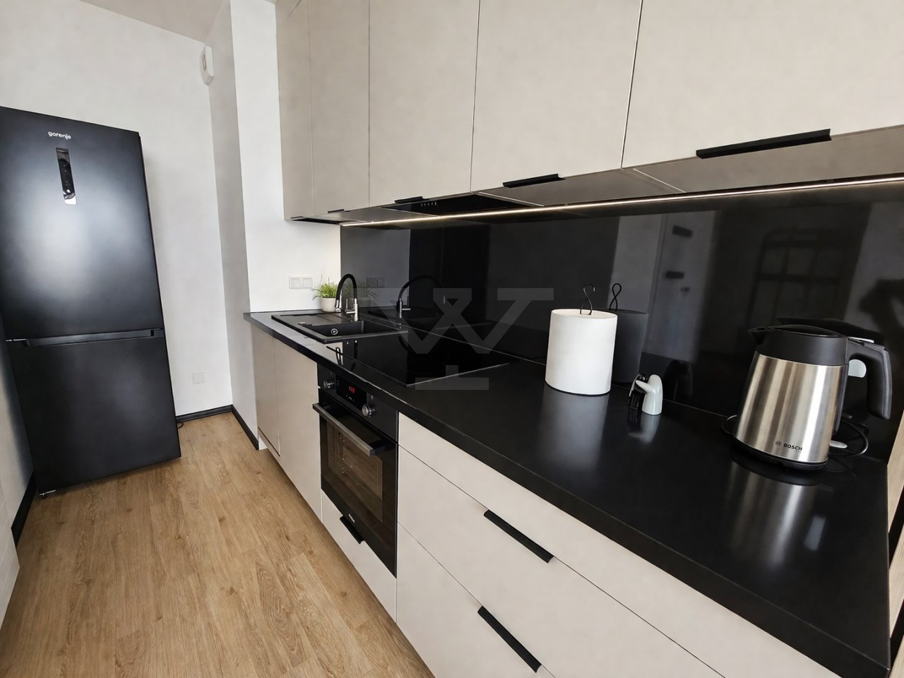 Kuchnia wyposażona jest w lodówkę, płytę indukcyjną, piekarnik, zlew z baterią oraz dużą ilość miejsca roboczego na blacie. Dodatkowym atutem jest spora ilość szafek, które zapewniają wygodne przechowywanie.