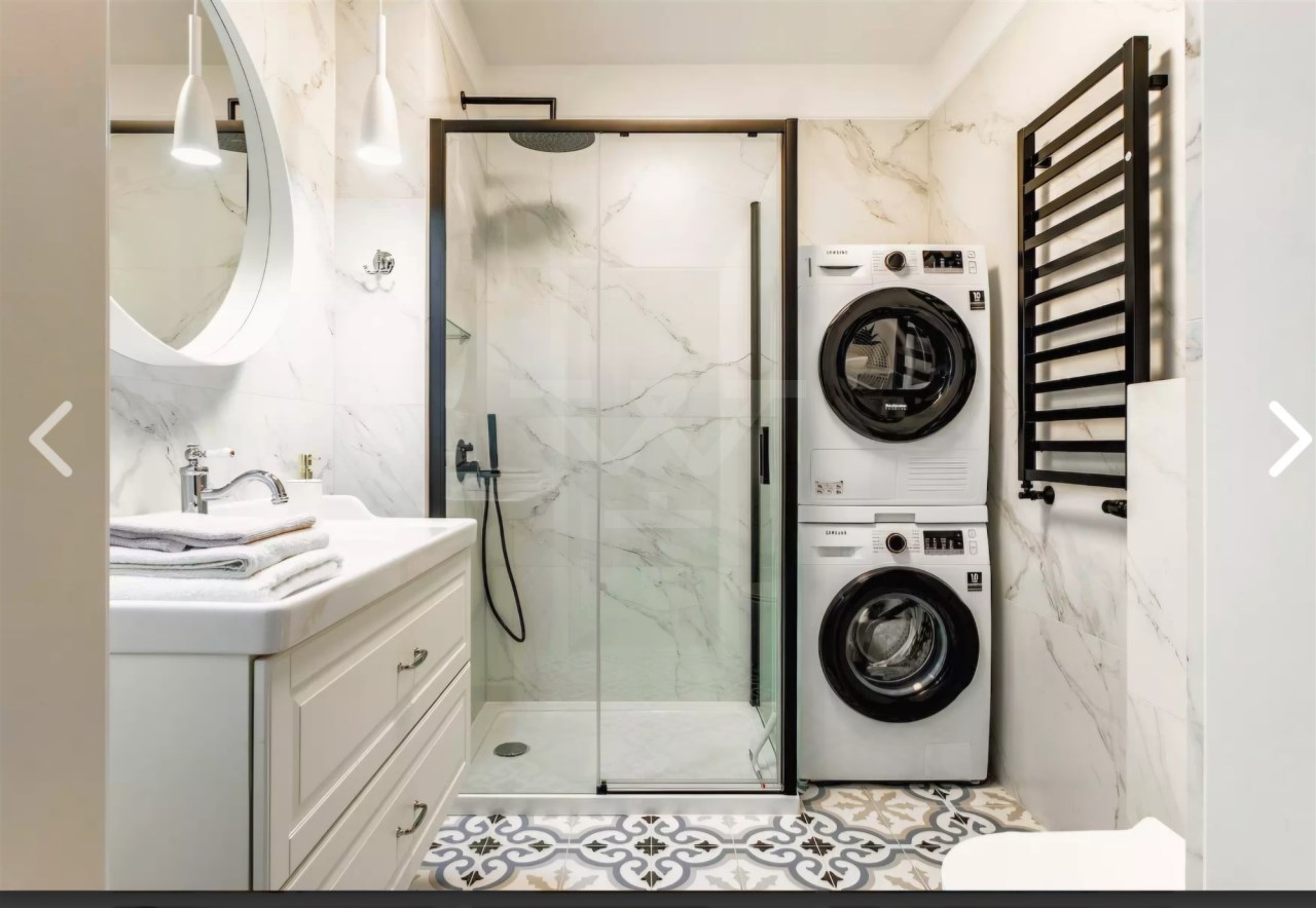 przestronna łazienka z dużym prysznicem, pralką i suszarką bębnową,