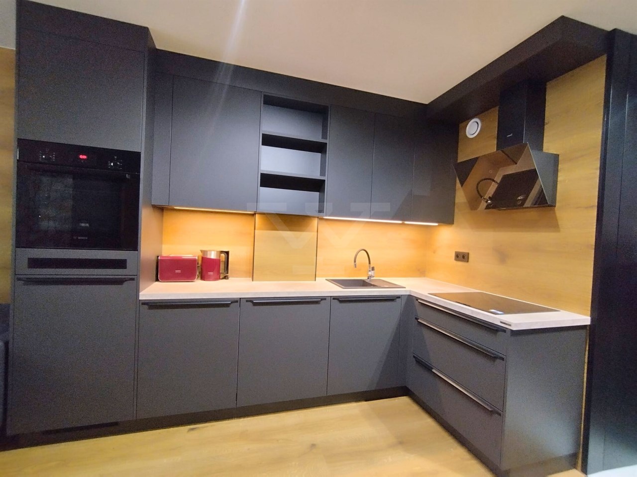 Otwarta kuchnia w pełni wyposażona w sprzęty AGD (lodówka, piekarnik, płyta, zmywarka, okap)