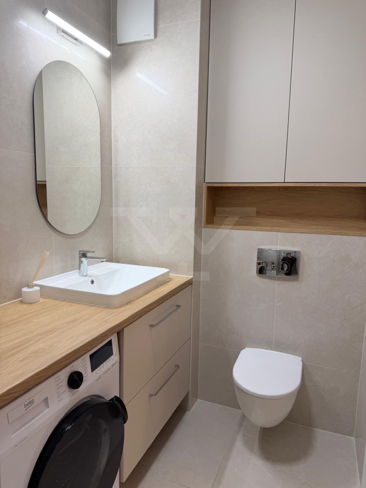 Lokal jest w pełni umeblowany i wyposażony w sprzęt AGD (lodówka, kuchenka, piekarnik, pralka) — gotowy do wprowadzenia.