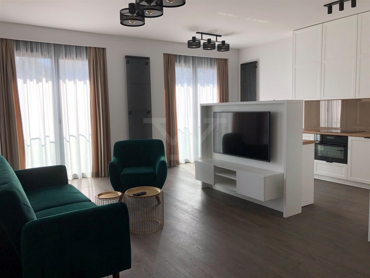 salon z aneksem kuchennym oraz wydzieloną częścią jadalnianą,
