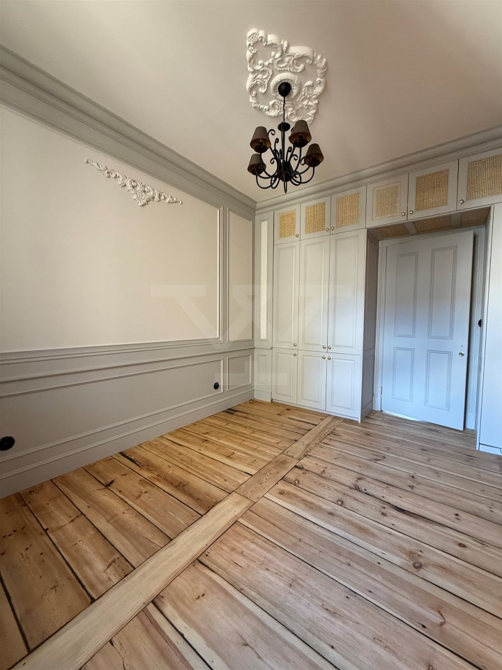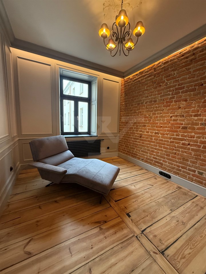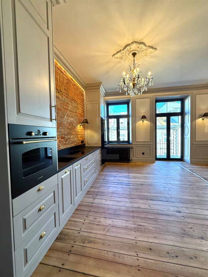 Wnętrze zostało zaprojektowane z dbałością o każdy szczegół – odsłonięta cegła w połączeniu z ozdobnymi sztukateriami, kryształowymi żyrandolami i naturalnym drewnem nadaje mieszkaniu elegancki, a zarazem przytulny charakter. Wysokie sufity, drewniane podłogi i subtelne, jasne zabudowy tworzą wyjątkową harmonię między klasyką a nowoczesnością.