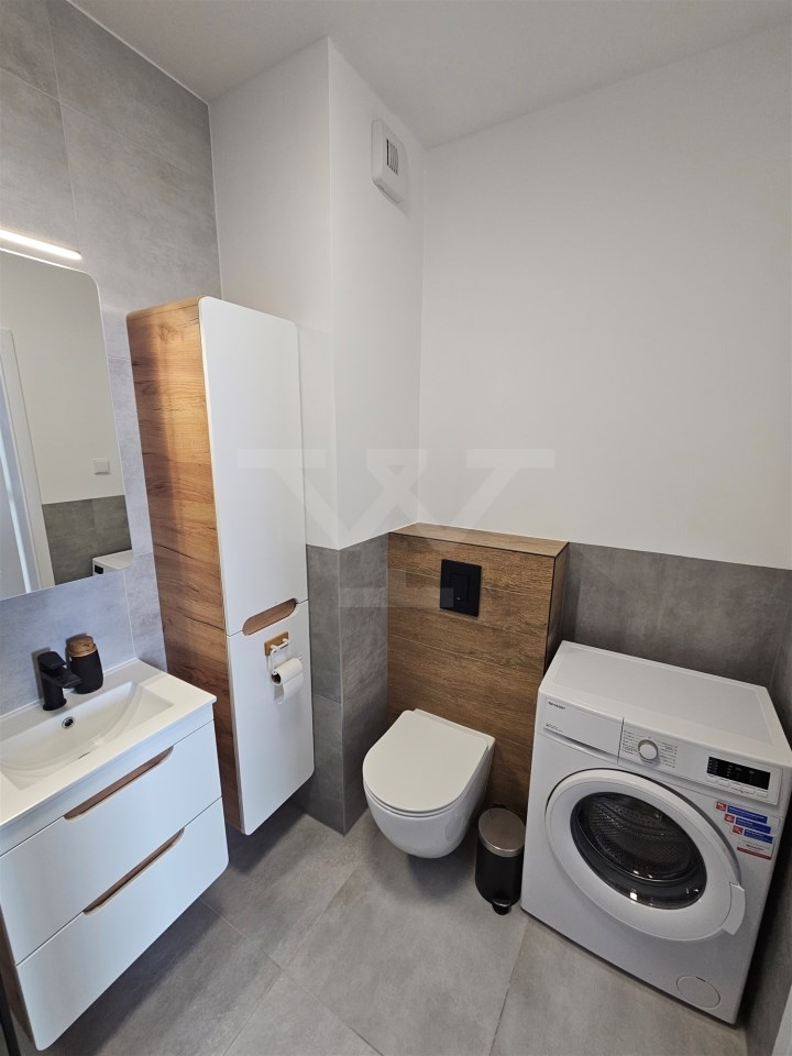 W łazience znajduje się kabina prysznicowa, umywalka, WC, pralka oraz praktyczna szafka do przechowywania.