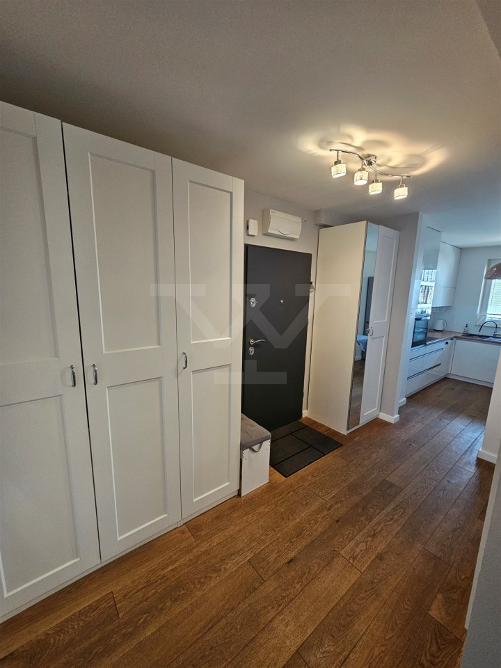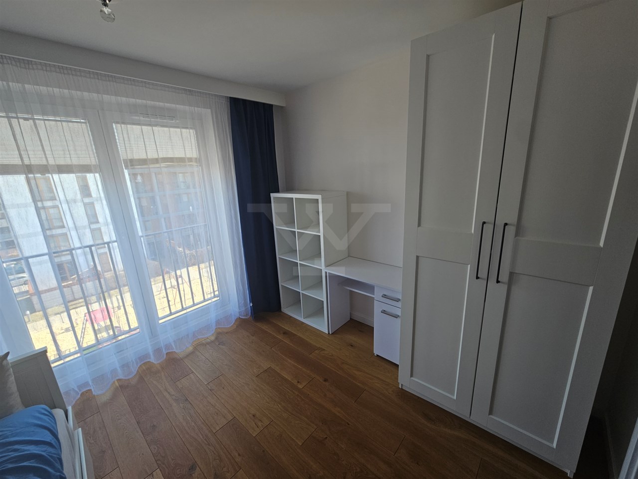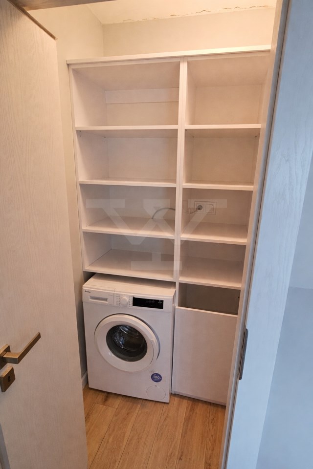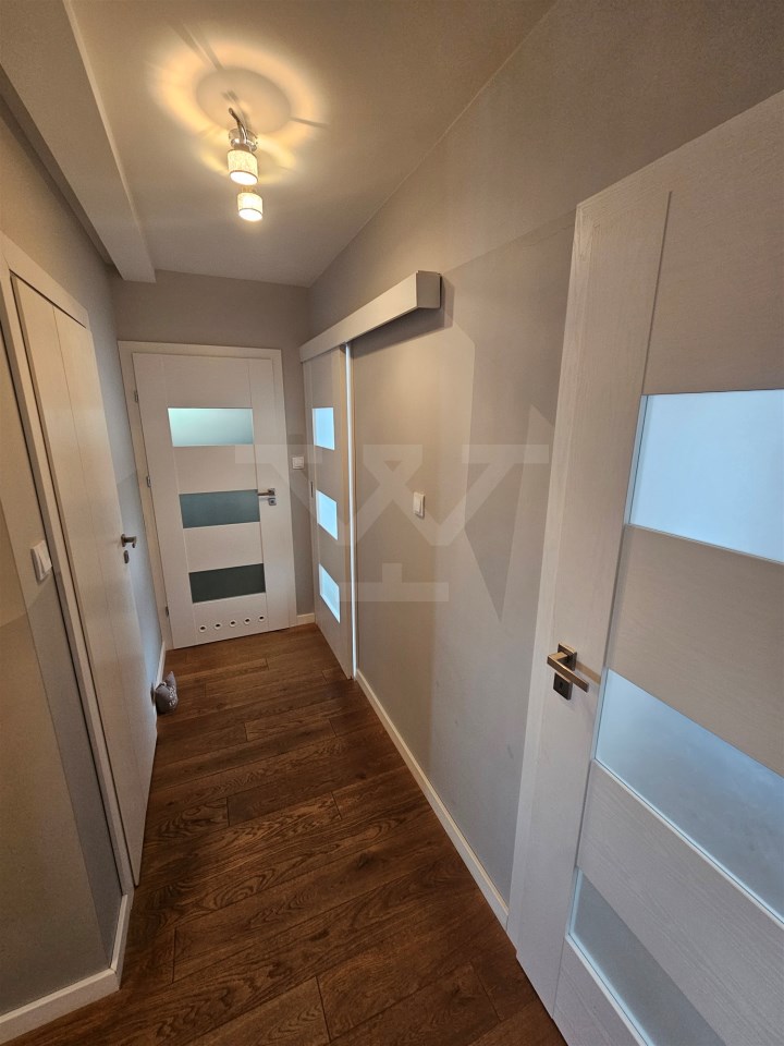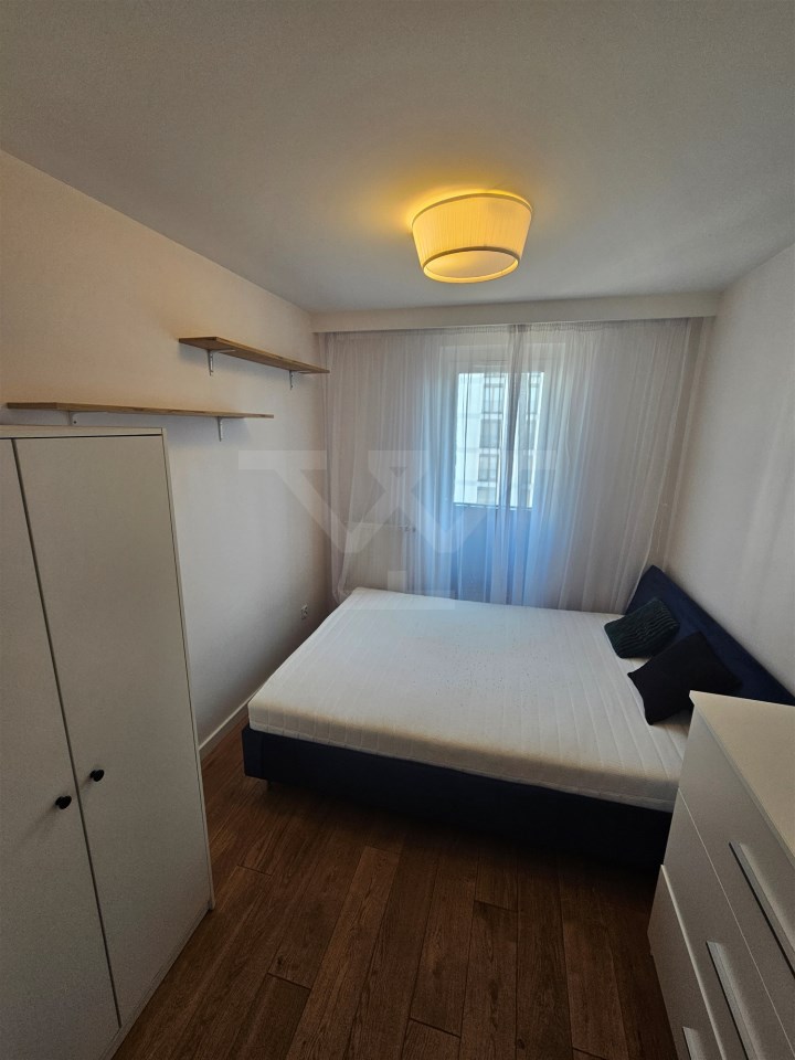 W sypialni głównej znajduje się duże podwójne łóżko, pojemna szafa i komoda, natomiast drugi pokój został przygotowany z myślą o pracy lub nauce, oferując składane podwójne łóżko, regał, szafę oraz biurko. Łazienka wyposażona jest w kabinę prysznicową i WC. Przestronny salon z wyjściem na balkon posiada rozkładany narożnik, stolik, komodę oraz duży telewizor LCD zamontowany na ścianie. Kuchnia jest w pełni wyposażona w nowoczesne AGD, w tym zmywarkę, lodówko-zamrażarkę, piekarnik elektryczny, płytę indukcyjną, okap i mikrofalówkę, a także stół do codziennych posiłków. Dodatkowo mieszkanie posiada garderobę z zabudową i pralką.