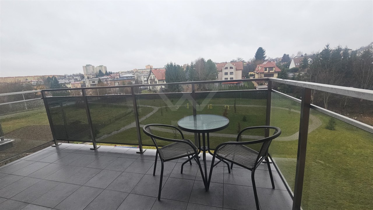 - Duży, słoneczny balkon od strony południowej z widokiem na ogród i zabudowę jednorodzinną.