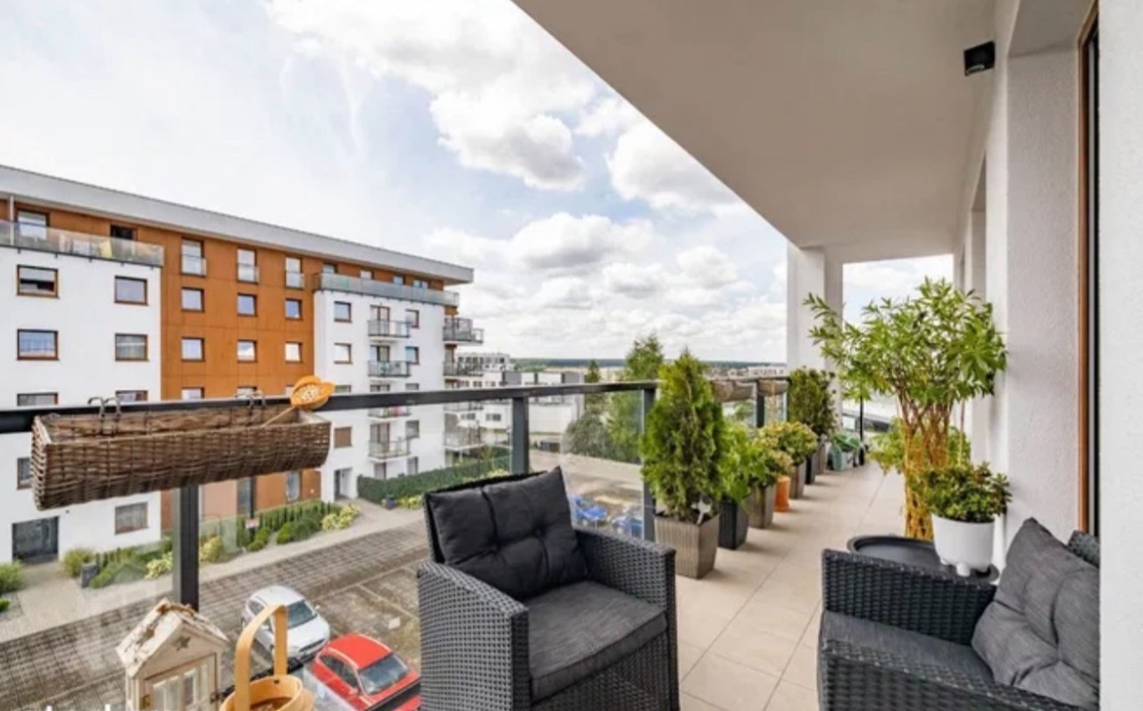 Atutem mieszkania jest duży taras, na który można wyjść z każdego pokoju.