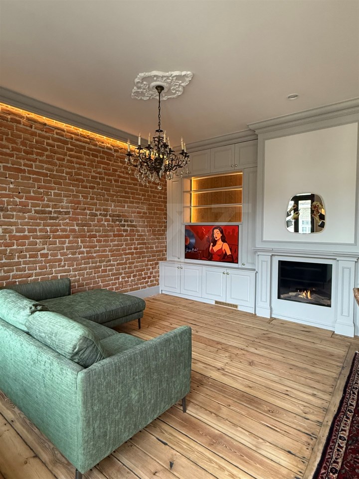 Wnętrze zostało zaprojektowane z dbałością o każdy szczegół – odsłonięta cegła w połączeniu z ozdobnymi sztukateriami, kryształowymi żyrandolami i naturalnym drewnem nadaje mieszkaniu elegancki, a zarazem przytulny charakter. Wysokie sufity, drewniane podłogi i subtelne, jasne zabudowy tworzą wyjątkową harmonię między klasyką a nowoczesnością.