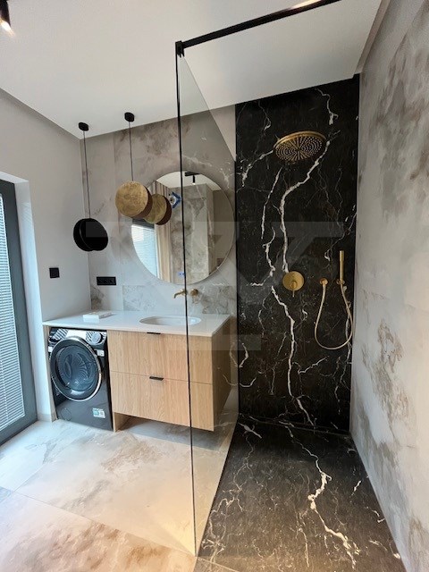 Wnętrza wykończone w standardzie premium: naturalny kamień, szlachetne materiały, jasna nowoczesna stylistyka